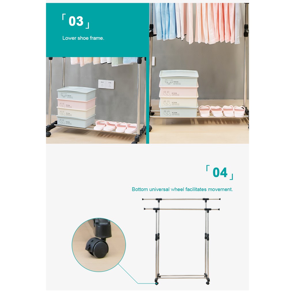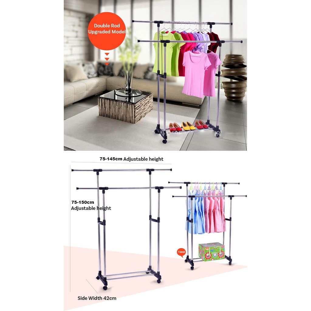 (SG STOCK) Adjustable Single & Double Pole Clothes Rack Stand Drying Rack Clothing Portable Hanging with Wheels