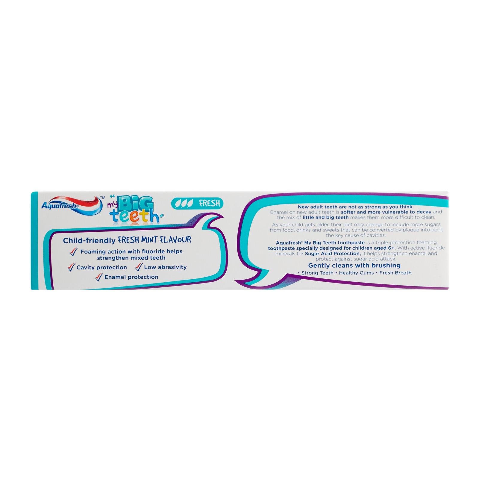 Aquafresh My Big Teeth Toothpaste is specially formulated by experts for children age 6+ years old. It fights sugar acid decay with sugar acid protection* thanks to fluroide and provides self-defence for their teeth. It is strong on protection but gentle on their teeth, to help kids teeth grow up strong! ​