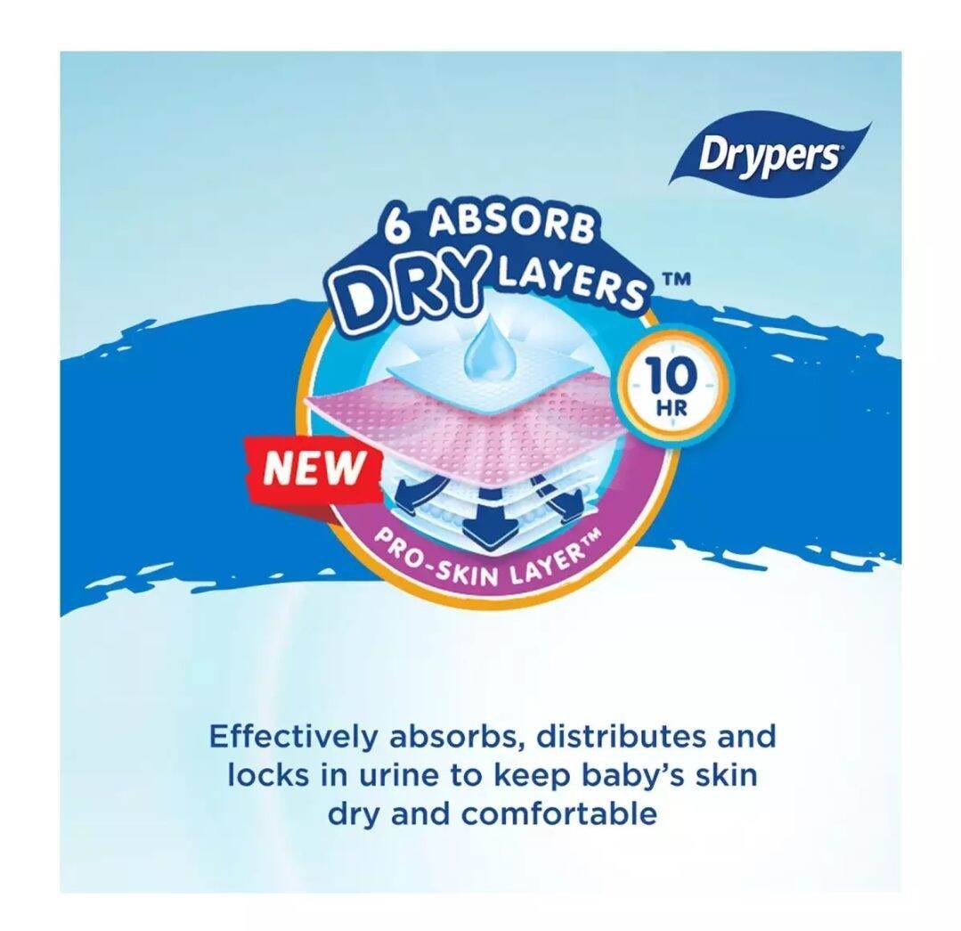 - The revolutionary 6 AbsorbDry layers help to absorb urine faster, while preventing leakages and protecting baby's delicate skin!